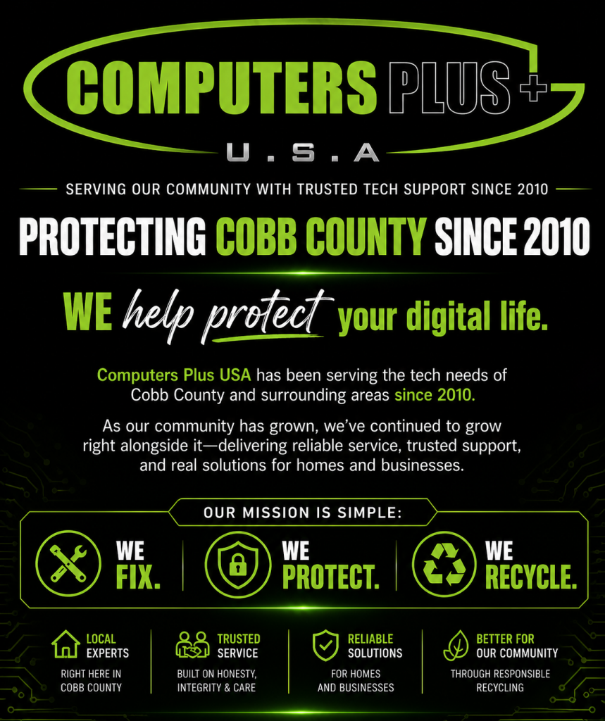 Computers Plus USA has been making Cobb County and the surrounding area customers happy since 2011. We were located at 3060 Cobb Pkwy ste. 105 for 71/2 years and decided to move to a larger location. 3330 Cobb Pkwy Ste. 154 30101 Follow us on Facebook, under Computerofkennesaw, computer repair kennesaw. Computer repair of Acworth or Computer repair Acworth. Look for our Twitter on special discounts and Youtube for tech friendly advice on computer repair needs.